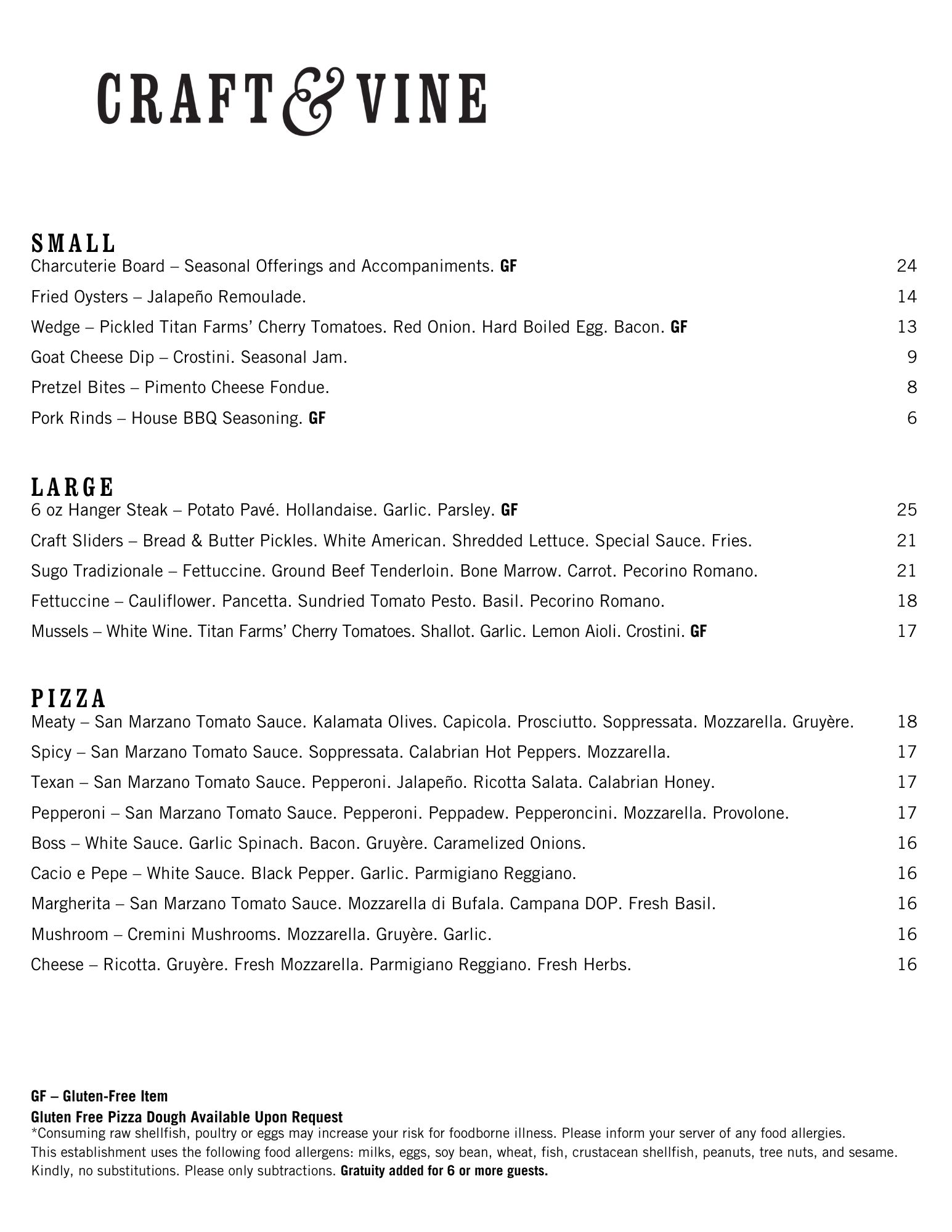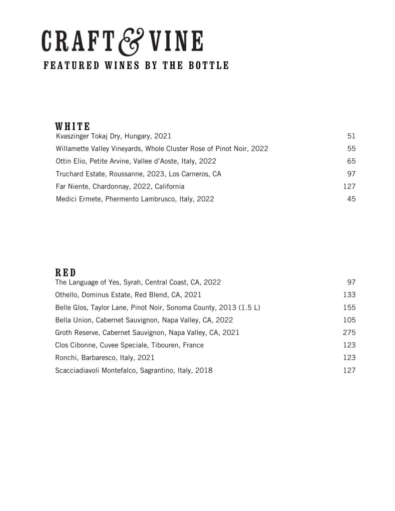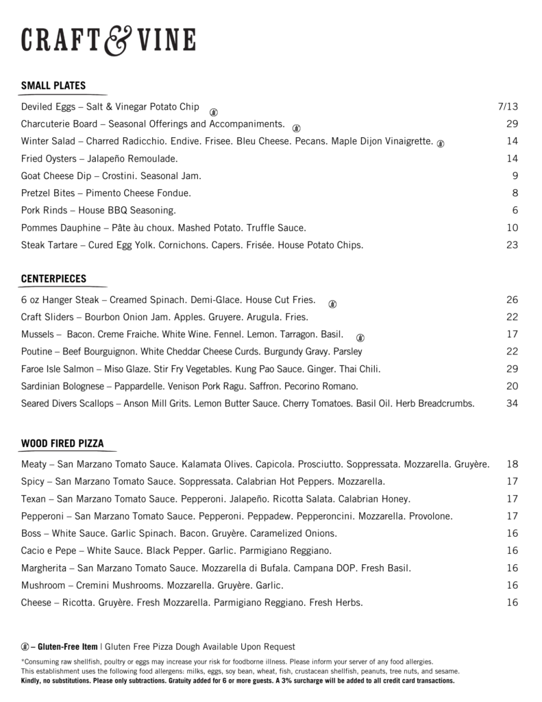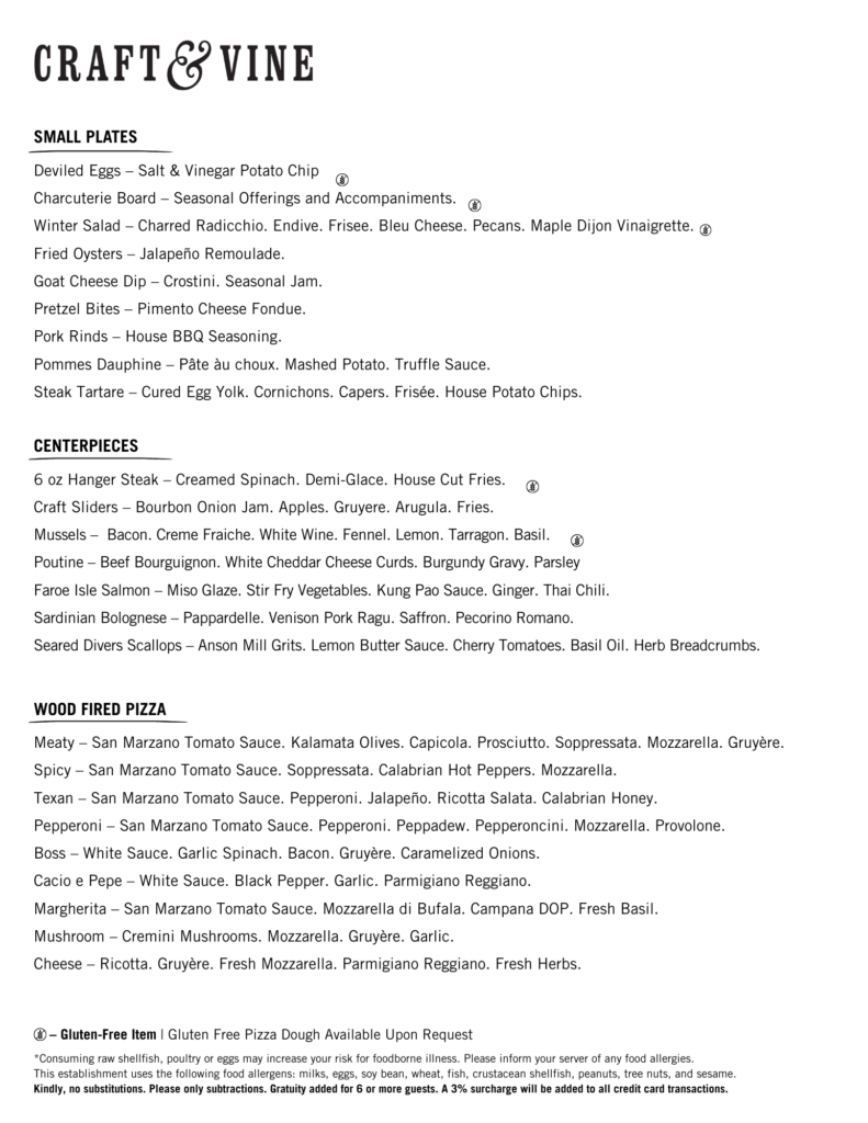 Craft cocktails, draught beer, 32 bottles of wine by the glass, a unique menu of small plates and wood fired pizzas with table, bar, and lounge seating!