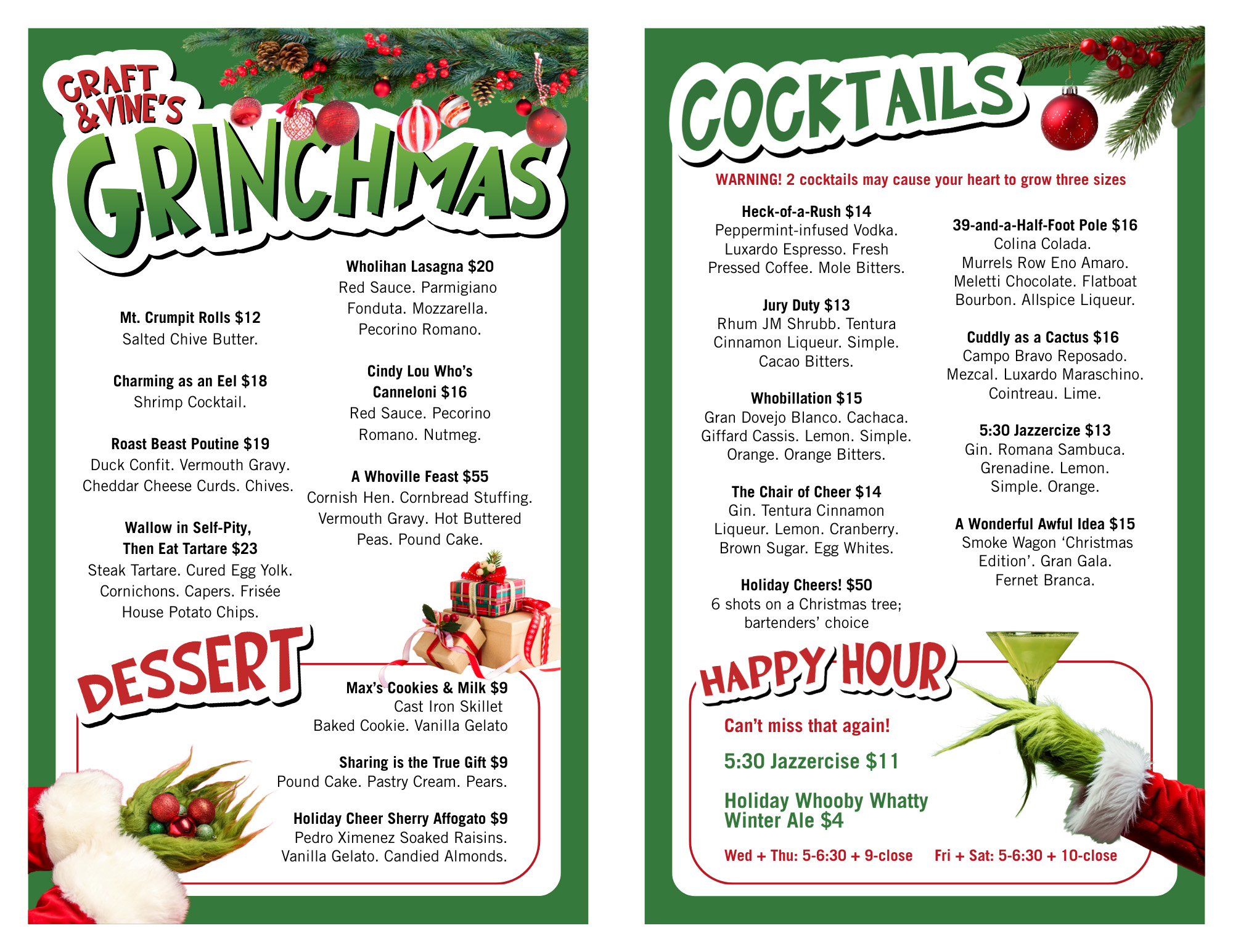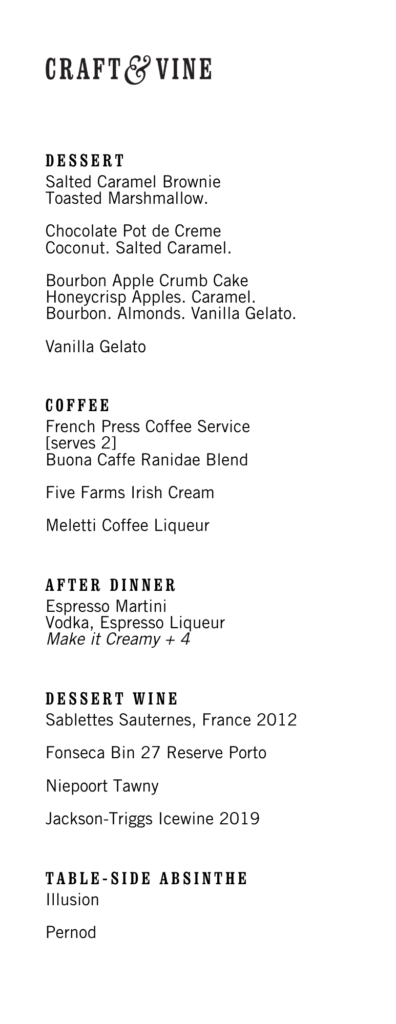 Welcome to Craft & Vine, an excellent member of the Frog Hollow Hospitality Group. We are a cocktail bar and eatery politely tucked away on Broad Street in downtown Augusta, Georgia. Featuring hand-crafted cocktails, an elegant wine selection, and gourmet small plates. A fusion of old wood with metal modern mix, low lights bouncing off art deco and leather.